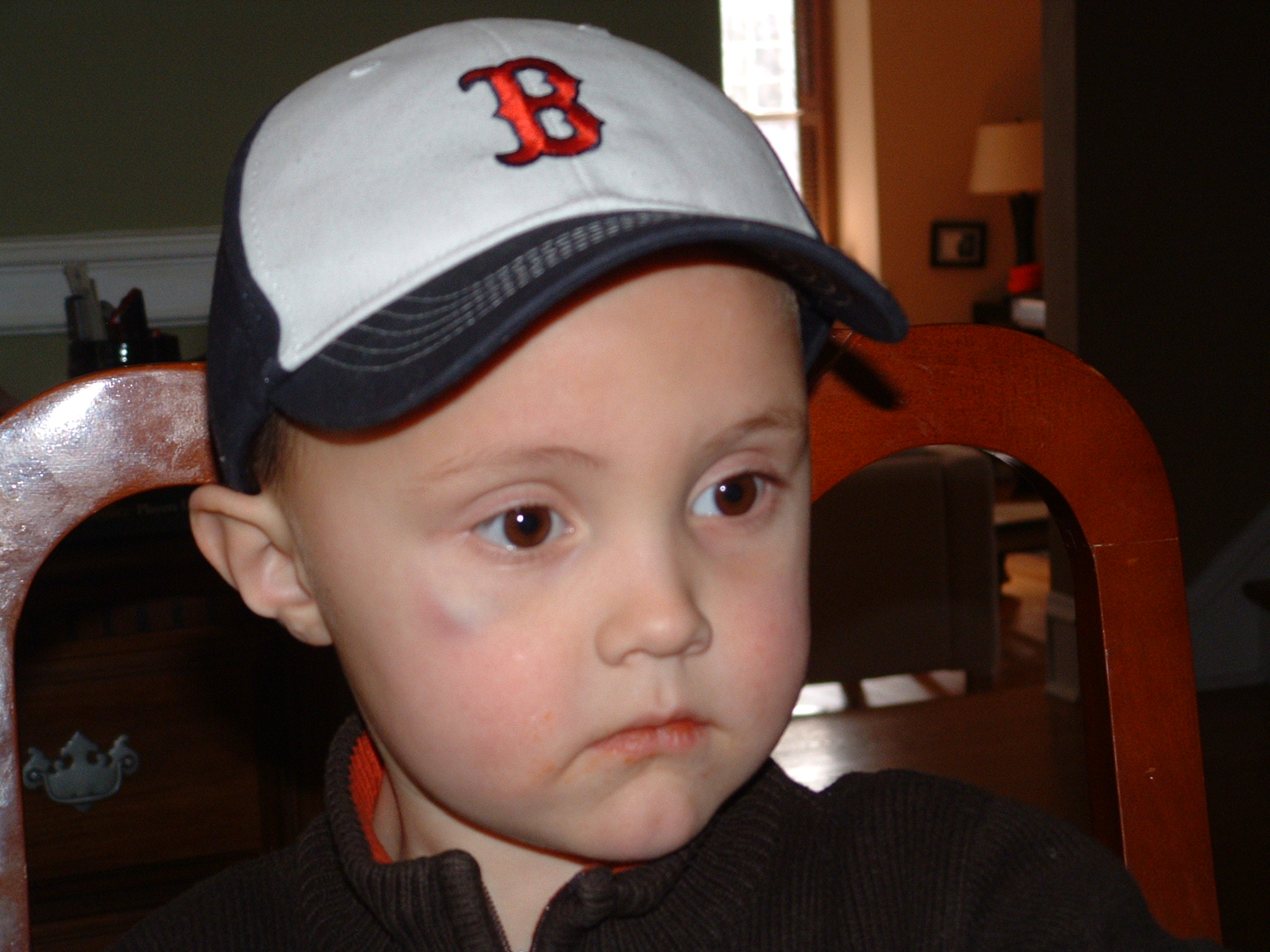 First, Big Brother got a black eye. During STORY HOUR. You know, the hour where kids sit quietly on mats while being hypnotized by the sweet voice of the librarian. Or in our case, the hour where Big Brother crashes his skull into the side of another boy’s skull and then screams like a t-rex for a painfully long time and story hour comes to a screeching halt while Momma Bear tries to comfort her son while her other son is blocking his ears saying, “That’s annoying” and her baby daughter is trying to climb up her back. Ahhh. Ironically, Big Brother was wearing his Boston hat, which he proudly informed us the other morning means, “B. Because I’m the bravest.” Equally as ironic, I went to great lengths this morning to make sure the kids were clean and well-dressed so we wouldn’t look like a bunch of ragamuffins at the library. Hmmm.