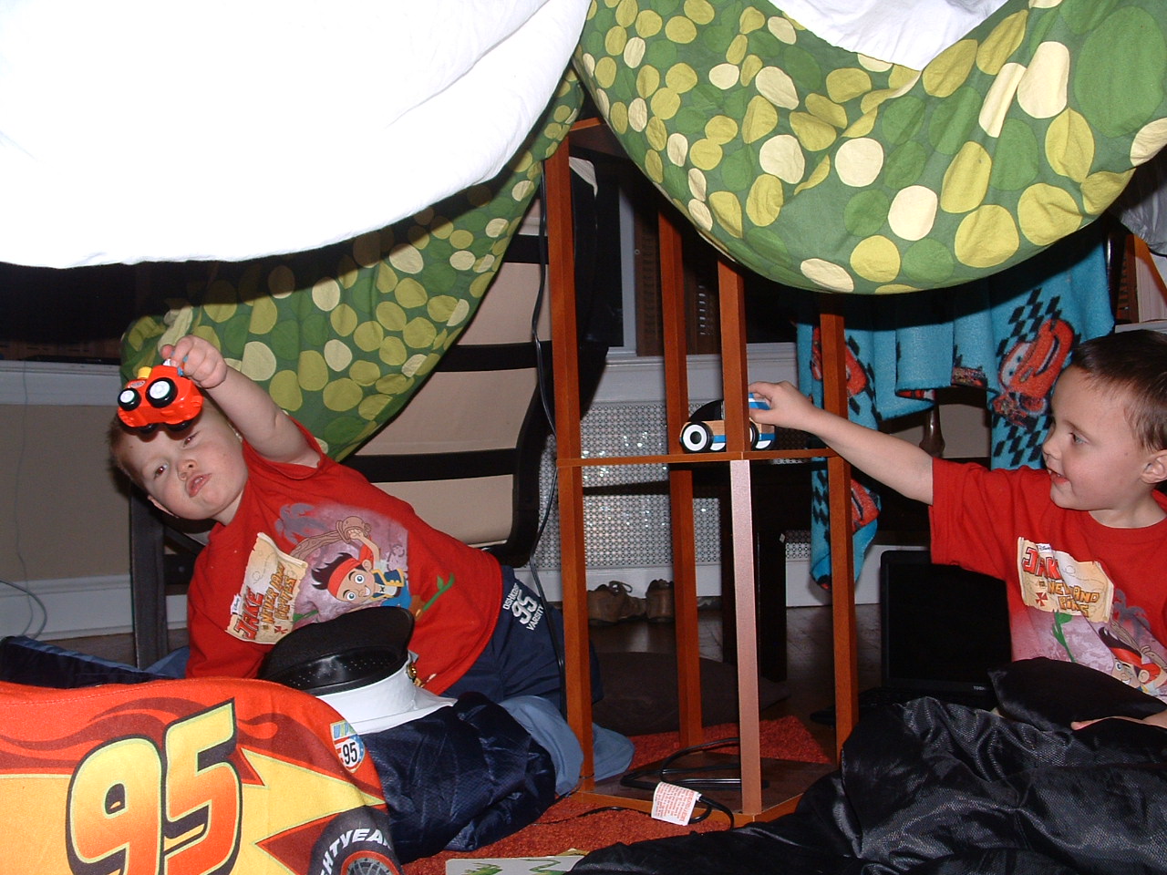Two comforters and a sheet, a coffee table, a piano stool and an end table. Two rocking chair, one ottoman, an amplifier and a coat hanger. One floor lamp, a Marine Corps cover (hat) and dress shoes. Two sleeping bags, 2 pillows, and 2 very happy little boys. THAT is how Daddy makes a tent.