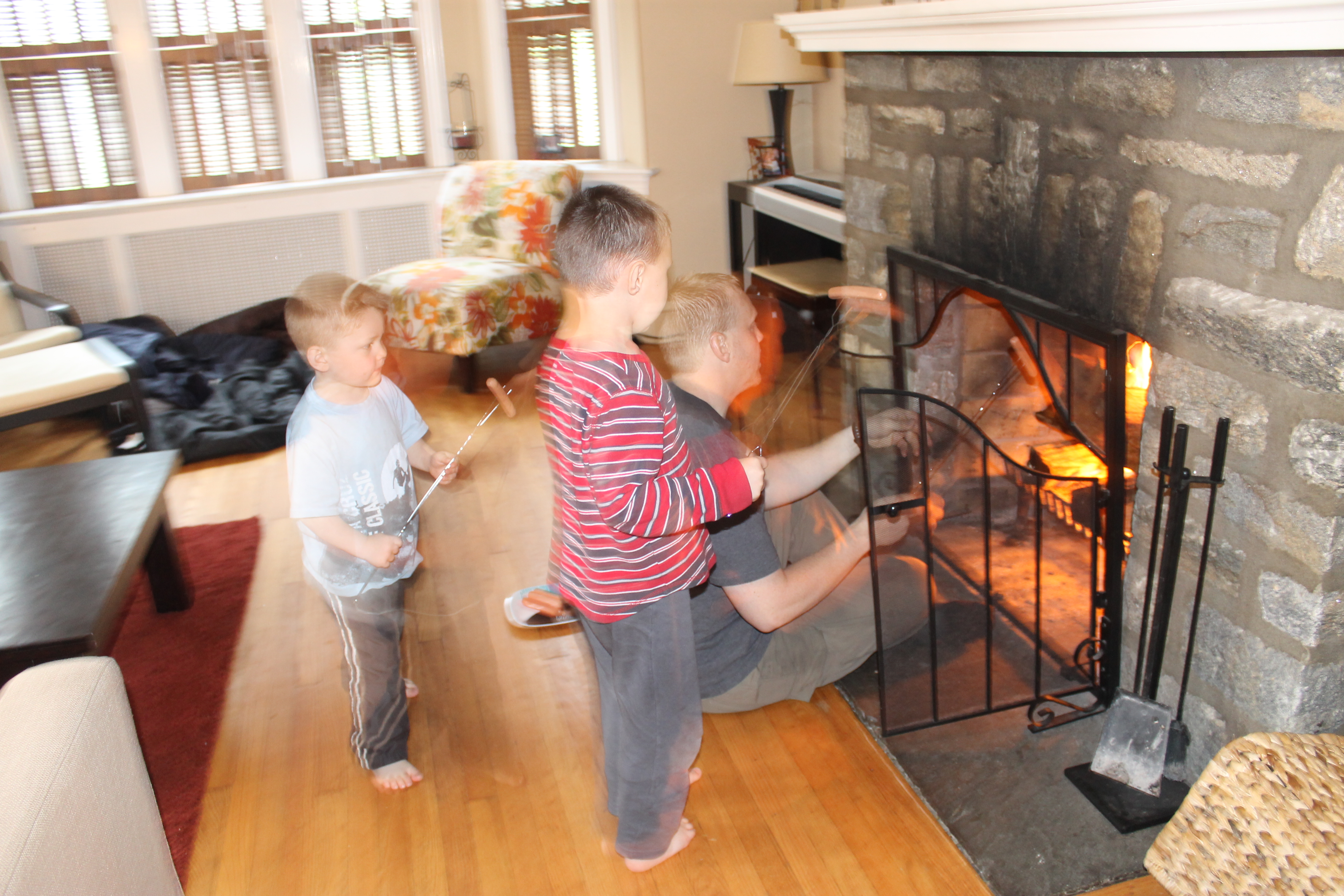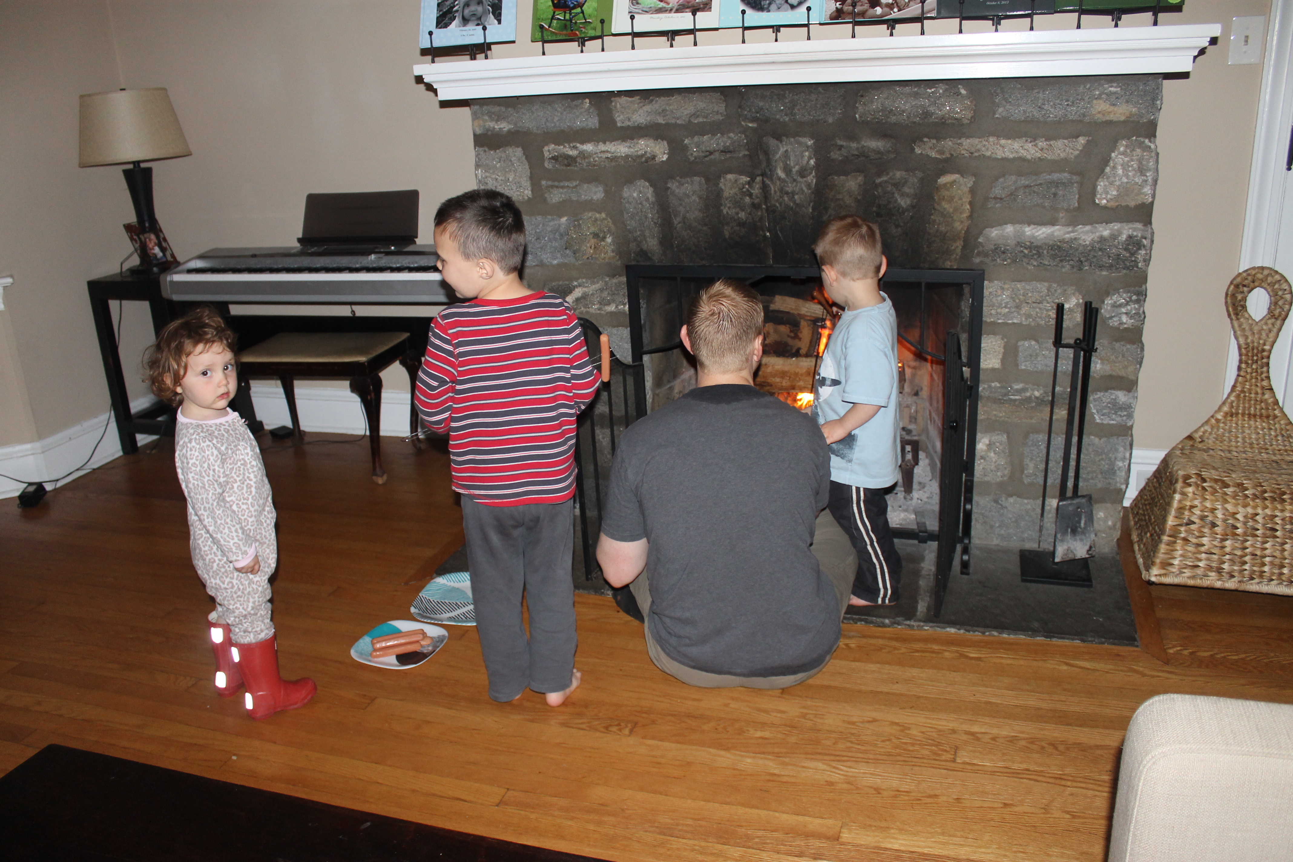 So we get home, sleep in, go out for a warm breakfast, come back home and roast hotdogs and smores by the fire. And recover. Notice the eyes. The glazed over, vacant stares.