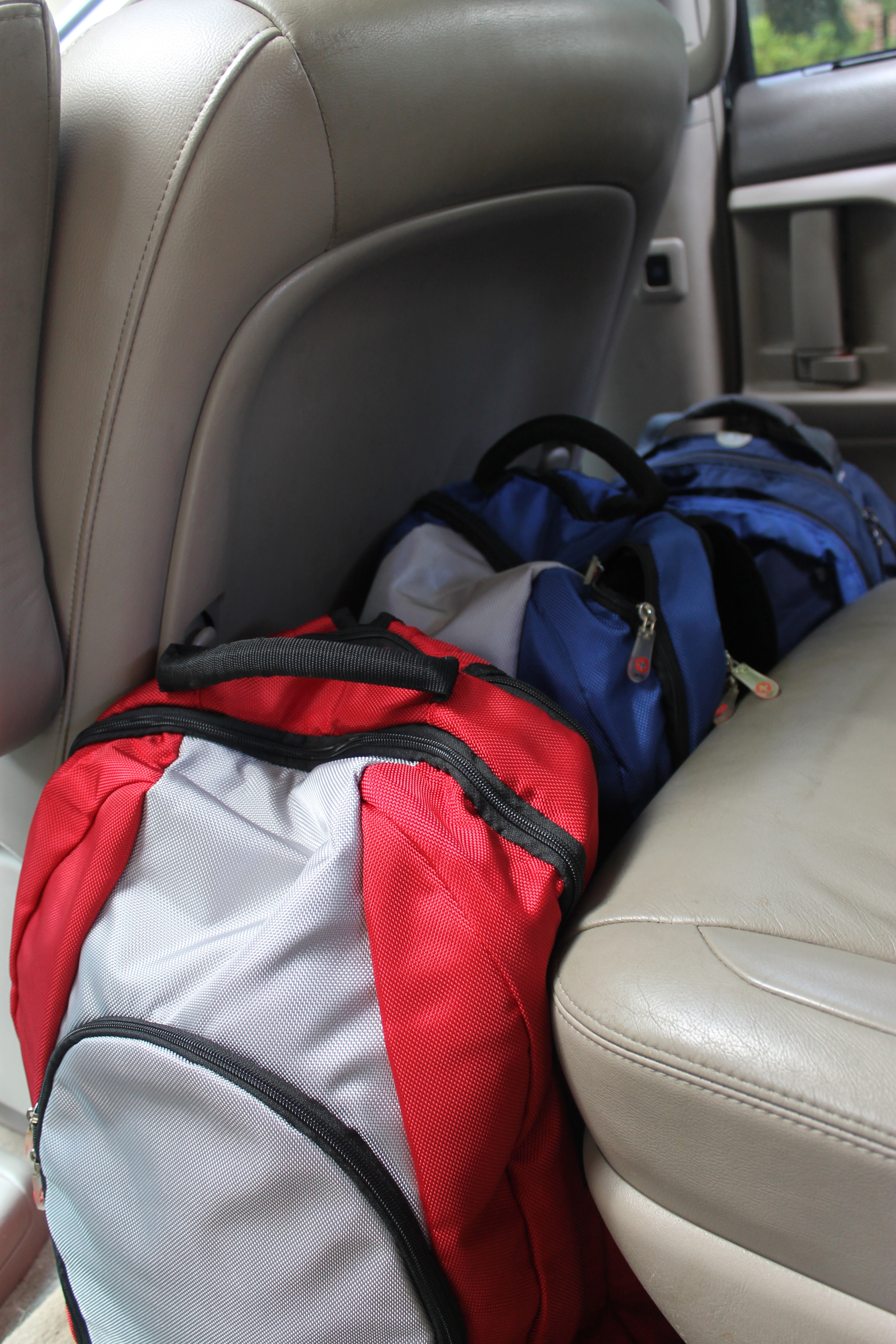 1. Back Pack. Yup, each child gets a backpack, filled with clothes and undies/ diapers. They are stashed behind the passenger seat so that, when we arrive at our destination, they grab their bag on the way out. They feel very cool doing this. And I feel less heavy-laden….literally.