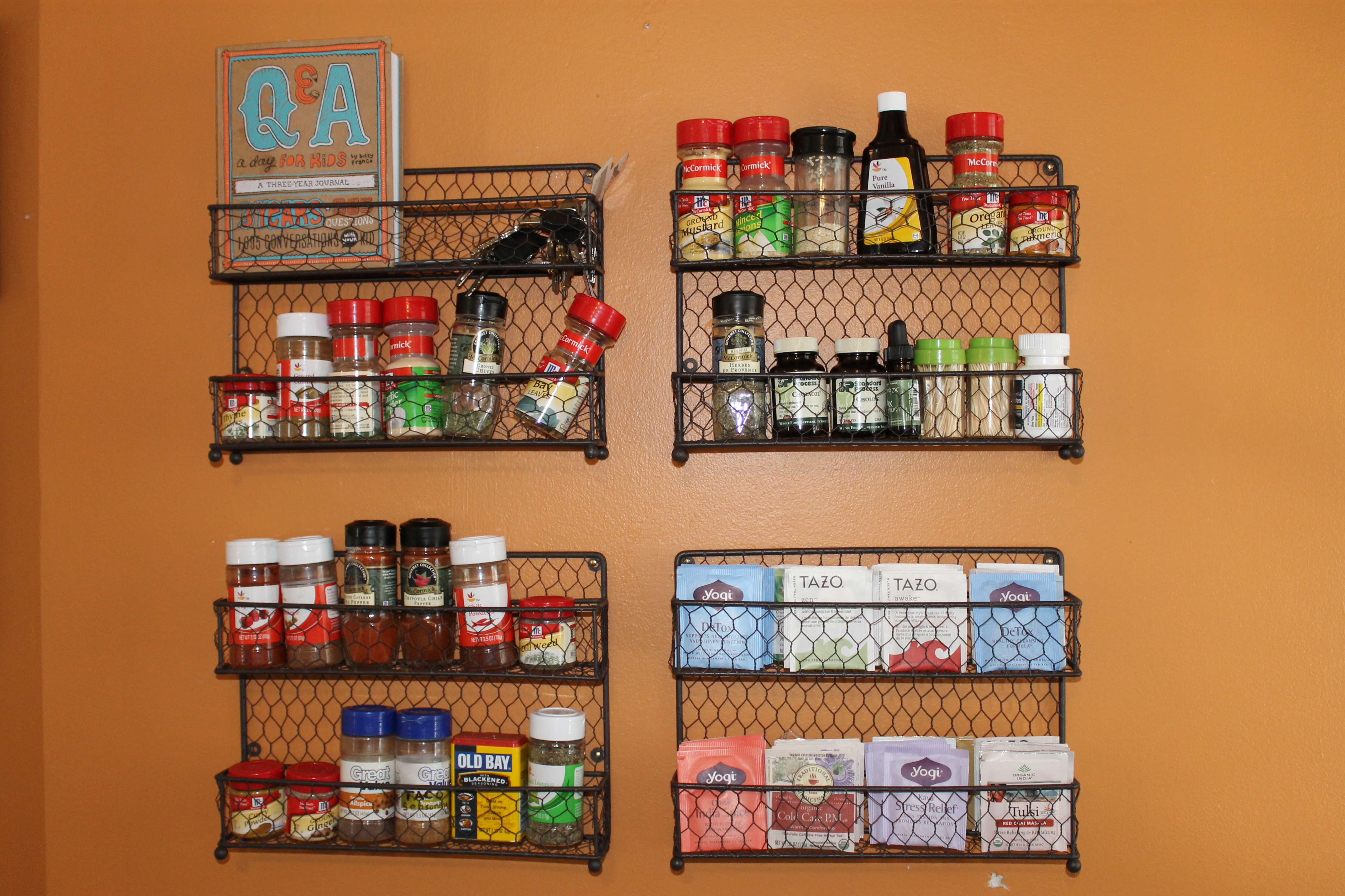 3.  I have a tea wall.  Because a hot cup of tea is like a warm hug.  My tea selection may indicate the cycles of my days- Awake.  Zen.  Detox.  Stress Relief.IMG_3308