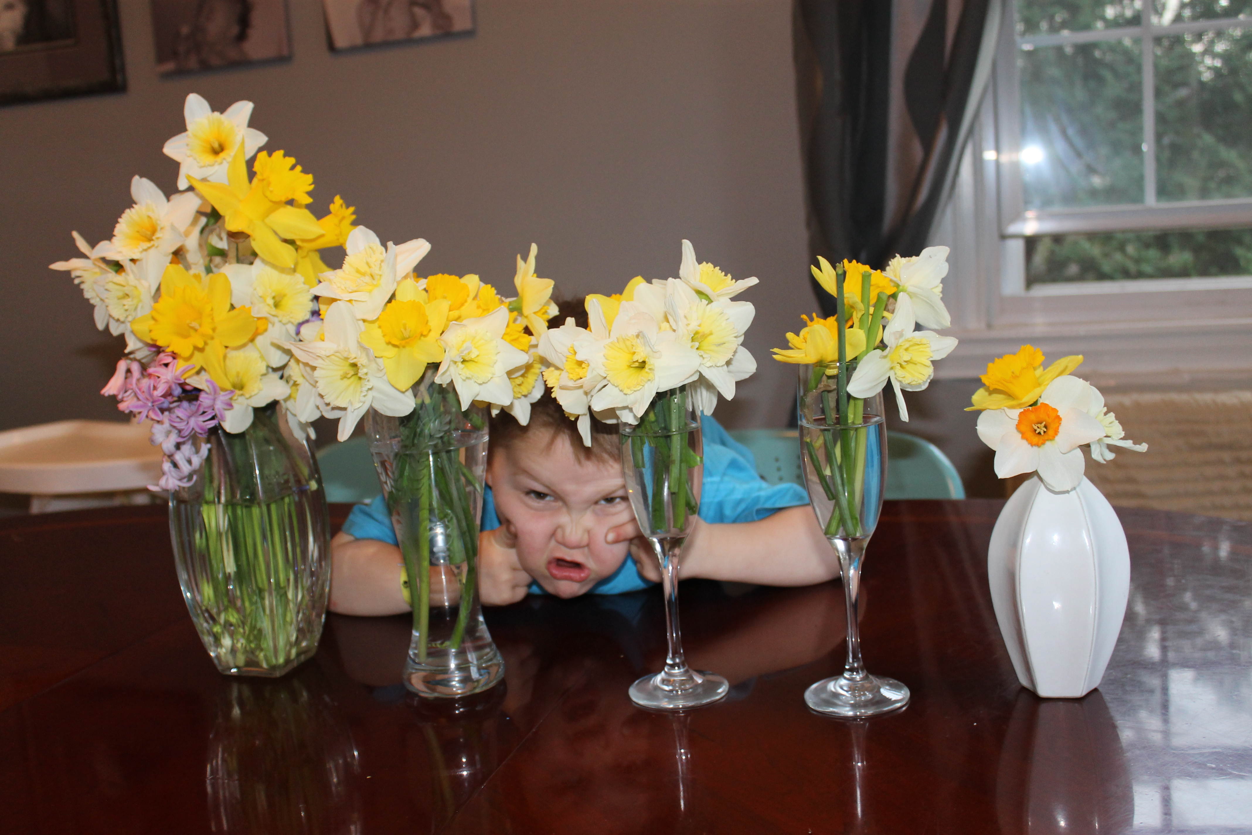So tonight, as my (dirty, stinky) boys ran from the garden with fist-fulls of flowers, my first response was panic.  These poor flowers!  I’m pretty sure their brave petals bloomed just today, and now they’re plucked up! I didn’t tell the boys they could do this!  They didn’t ask permission!! What will the neighbors think? Where will I put them (the flowers, not the neighbors)?  I only have one vase!  Why don’t I have more vases???
