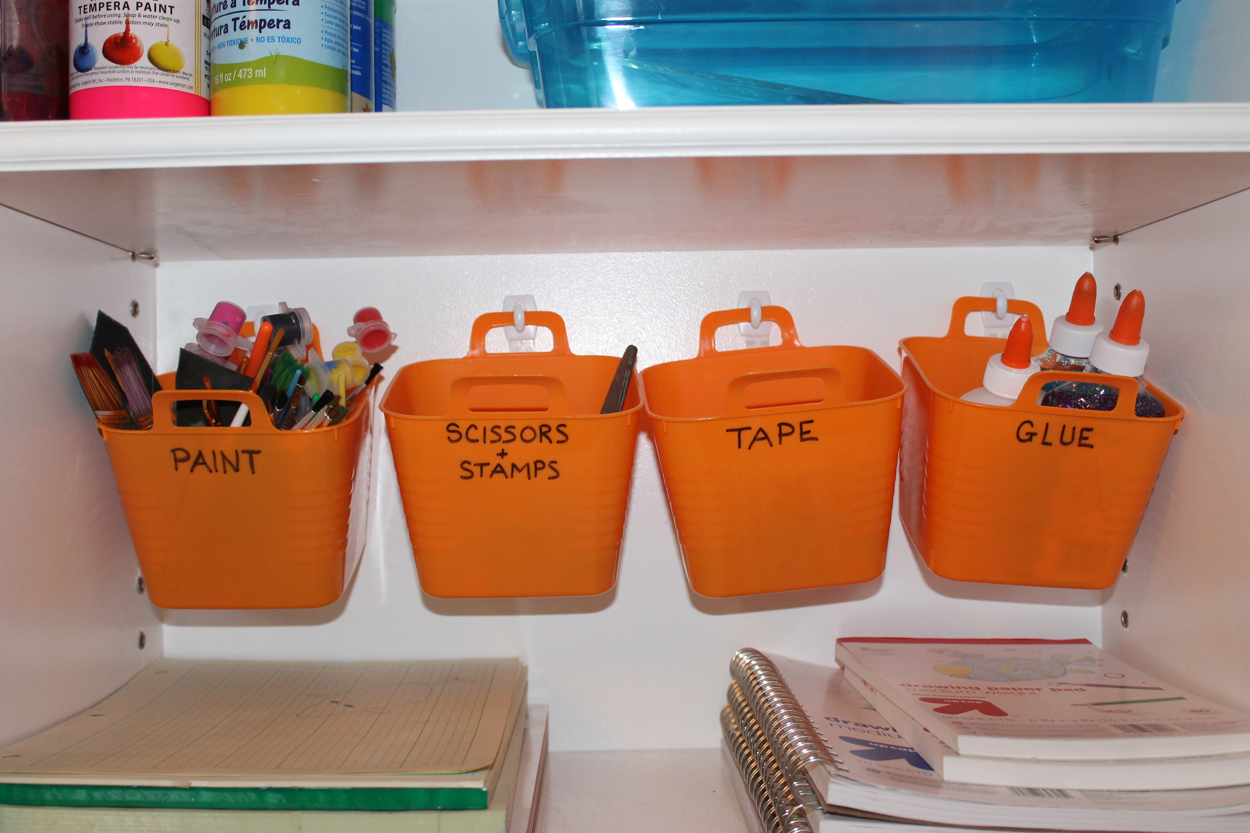 Thanks to a friend who recently turned me on to the endless wonders of Dollar Store containers and thus forever securing my fate as a container-holic, our school cabinet is more organized, colorful, and transportable.