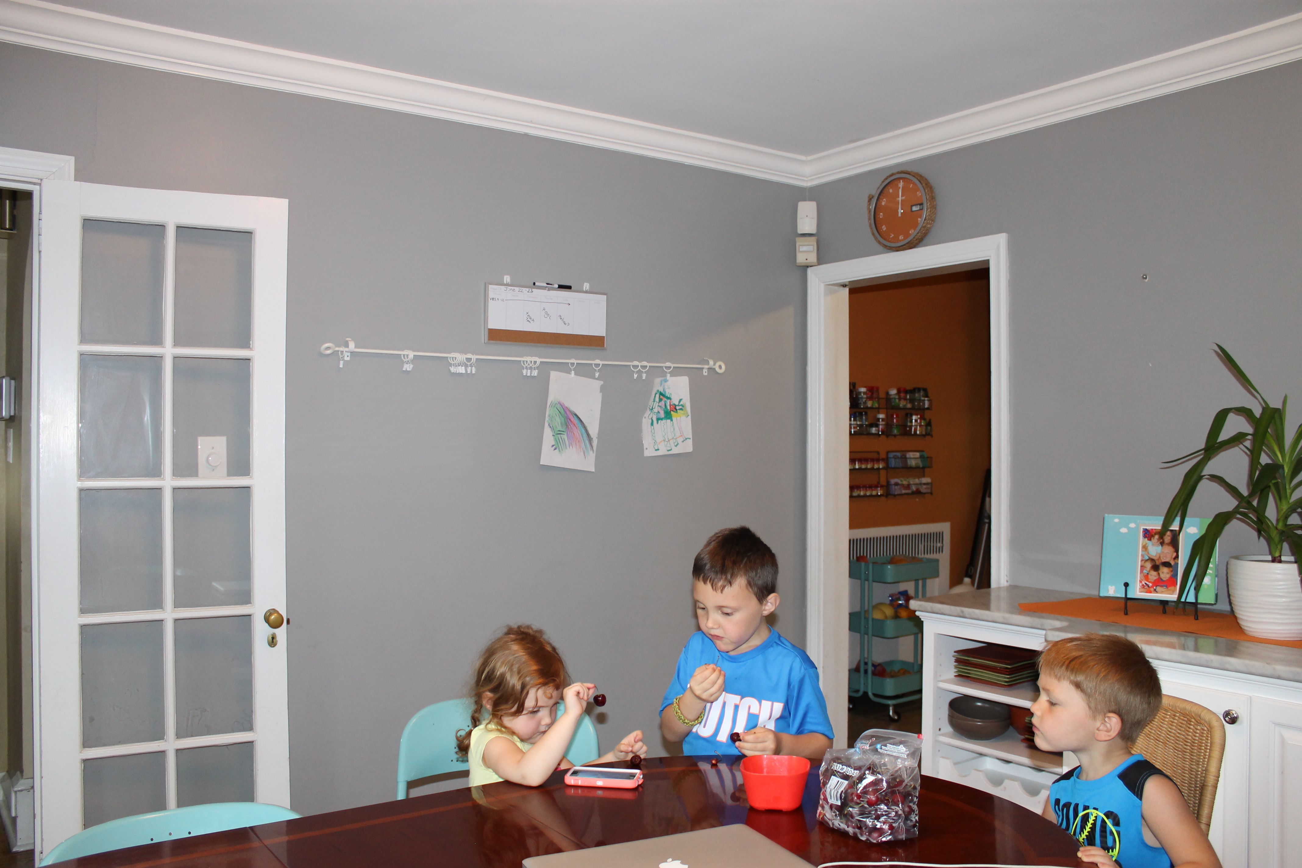 Above those 3 cute little heads hangs an old curtain rod that displays art work and each week’s school lessons, but not right now because it’s SUMMER!!!!  This curtain rod contraption has proven very useful since (1) it doesn’t take up counter-space and (2) we can review school while they’re eating, which is constantly.