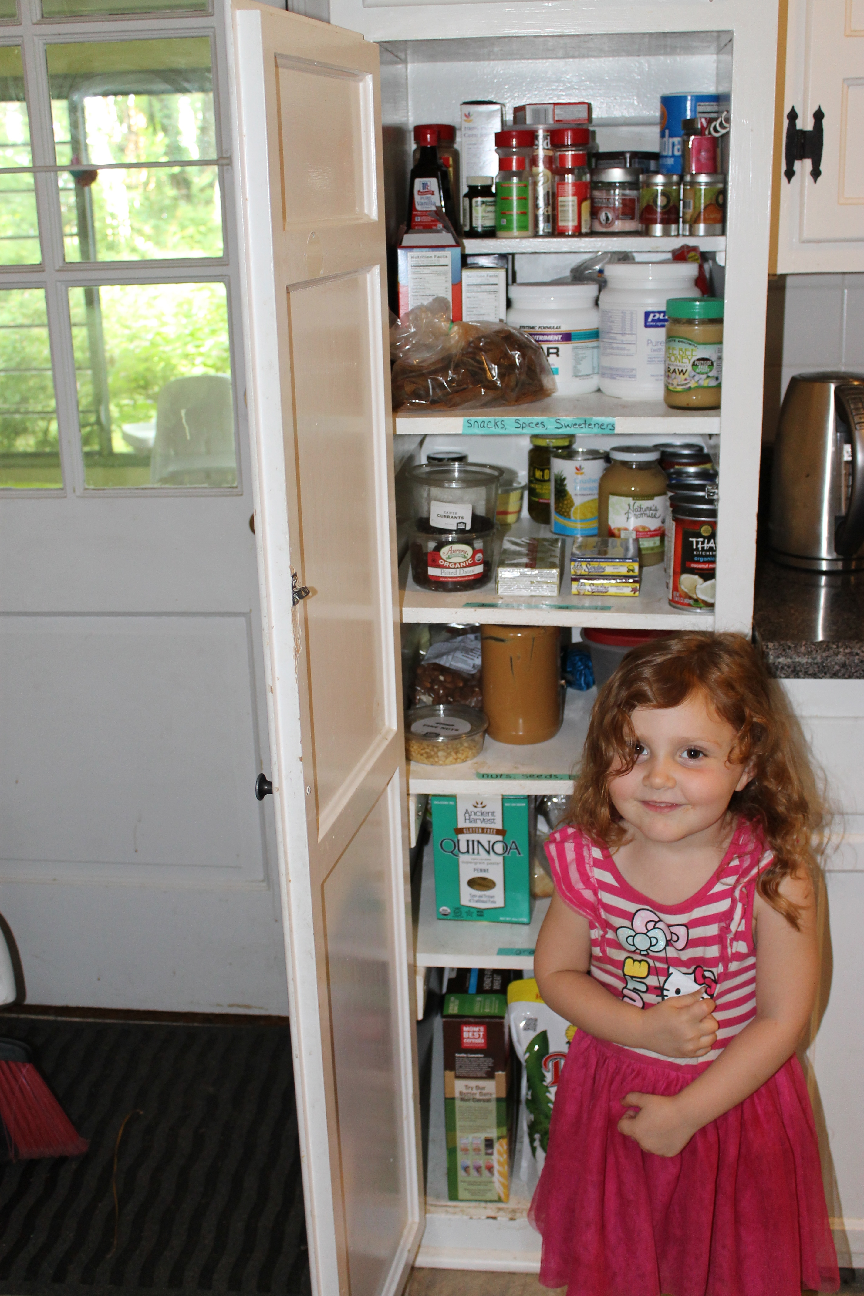 You may have noticed that our pantry is rather toddler-sized.  Thankfully, our diet does not require a lot of pantry items (yeah, we’re local seasonal produce people) but it still took some ongoing creativity for our pantry to make sense.  In the end, I went with labeled shelves.  From top to bottom: Snacks, Spices & Sweeteners; Dried Fruit & Canned Goods; Nuts, Seeds & Butters; Grains; Bulk.